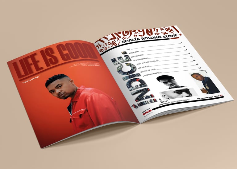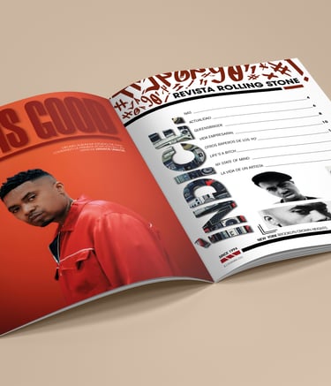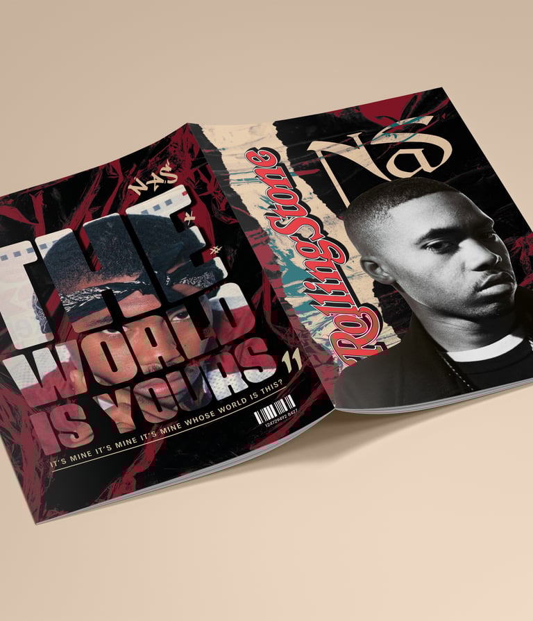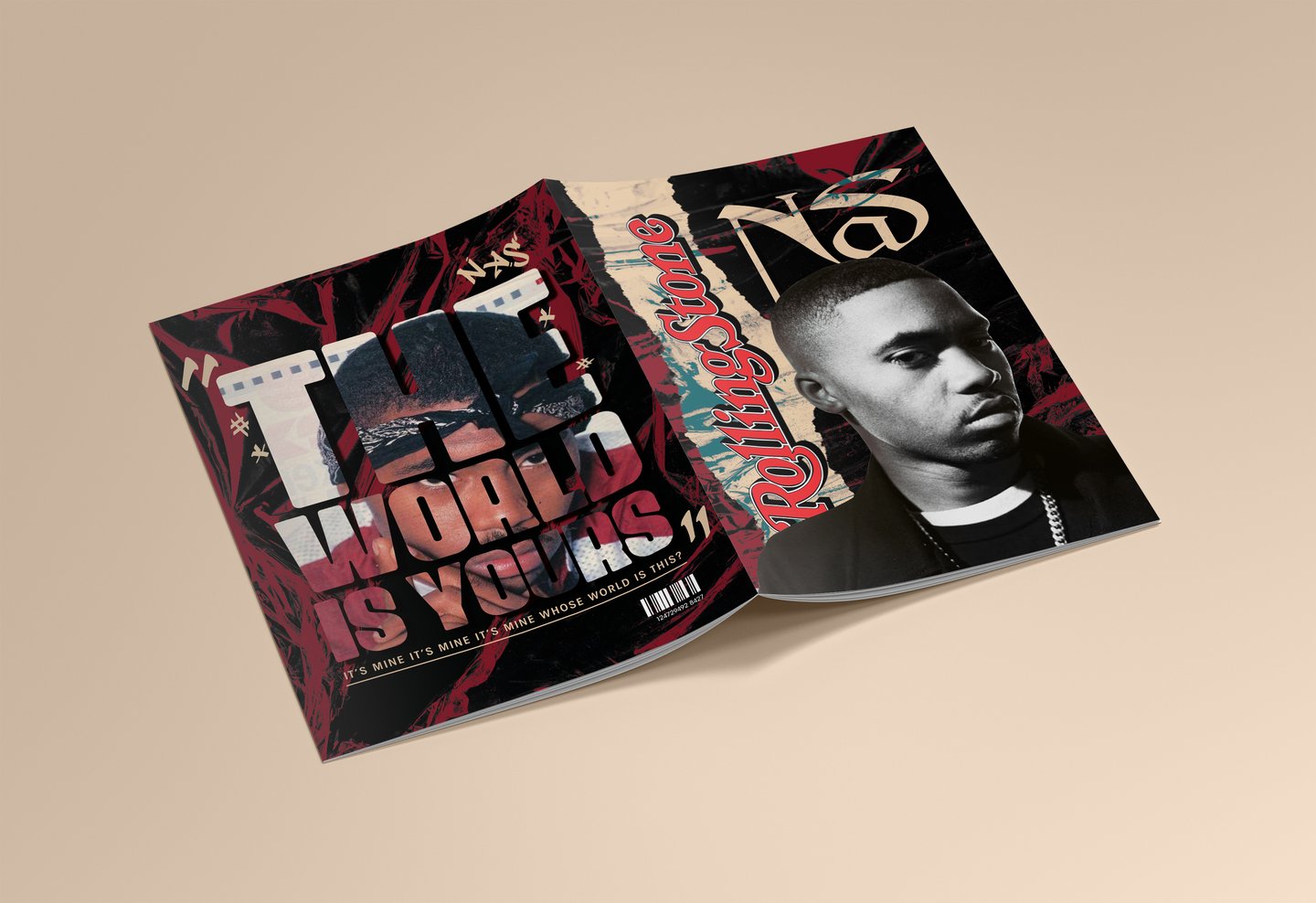 Un rediseño de la revista "Rolling Stone" enfocada en el artista "Nas", adaptada a un estilo agresivo y callejero.